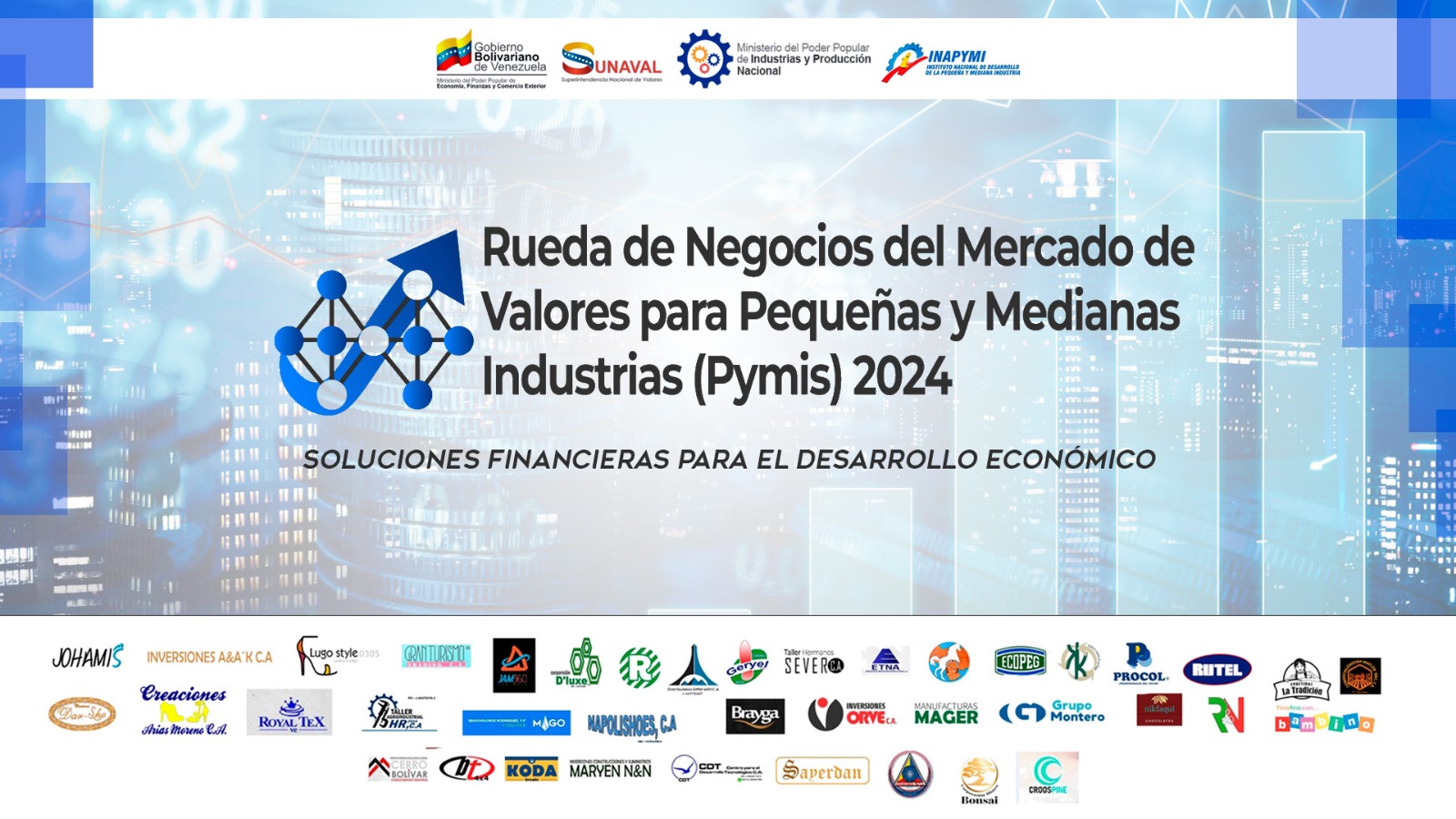 Para la segunda jornada de la Rueda de Negocios del Mercado de Valores, asistieron 18 Pymis de los diferentes estados del país, entre ellas: Creaciones Dar She C.A., R&N Textil C.A., Inversiones Tomar, R.D. C.A., Confecciones Croos Pine C.A., Distribuidora Eiffel 4011 C.A., CDT, Centro para el Desarrollo Tecnológico C.A., Inversiones BT 4×4 C.A., Alimentos Faca C.A., Creaciones Walk on C.A. (Pielsa), Calzados Johamis Sport C.A., Inversiones Nikfaqui 7701 C. A., Organización Rutel C.A., Inversiones Orve C.A., Inversiones Construcciones y Suministros Maryen N&N C.A., Masa Brayga C.A., Napoli Shoes C.A., Manufacturas Mager C.A., Manufacturas Geryel C.A., Confecciones Bambino C. A.
