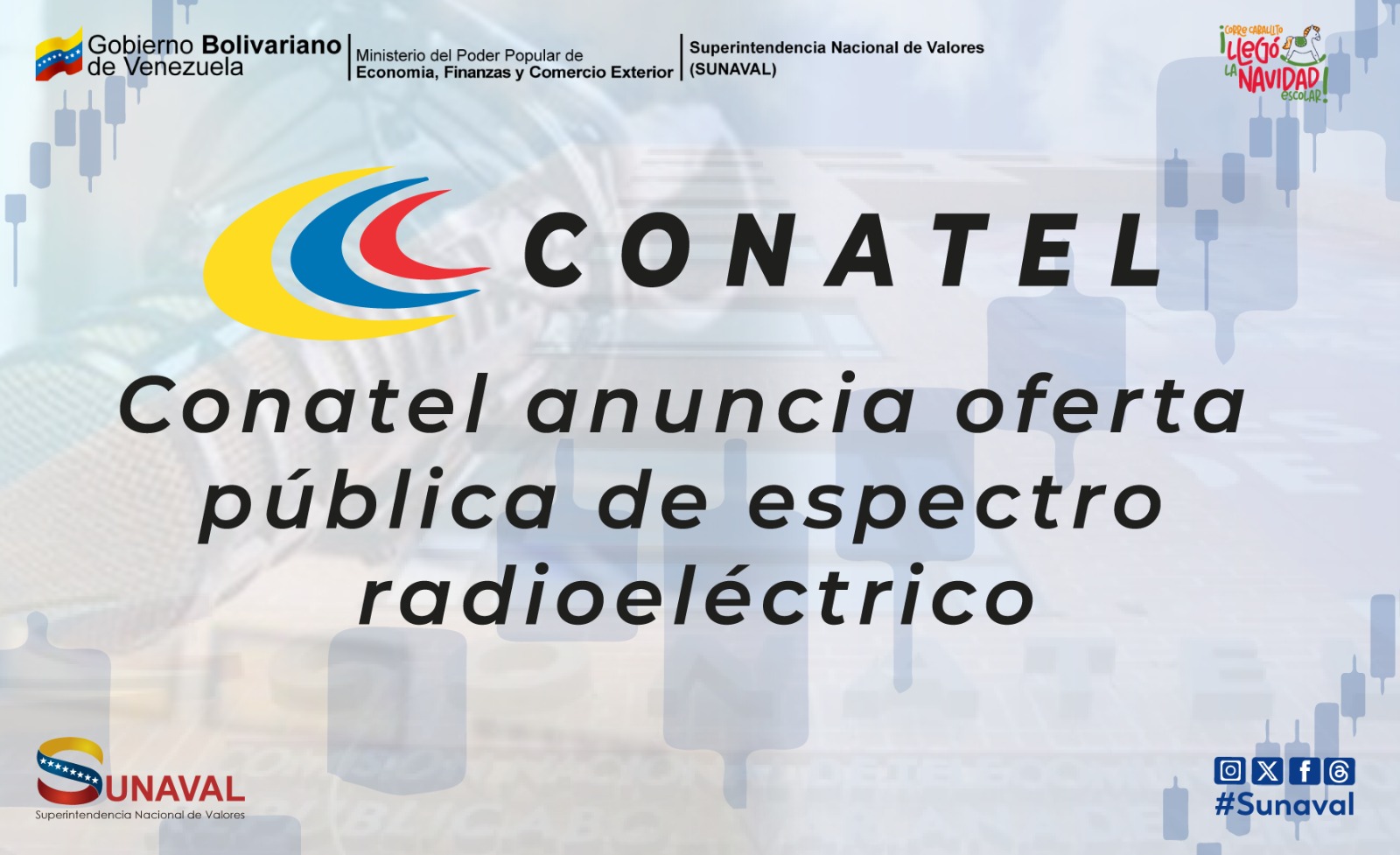 La Bolsa de Valores de Caracas, cumpliendo con su misión de servir al mercado de valores venezolano de forma ordenada, transparente, segura y confiable, y por solicitud de la Superintendencia Nacional de Valores (SUNAVAL), será la plataforma para la realización de la Oferta Pública para el otorgamiento de los bloques de frecuencia en el espacio geográfico nacional convocada por la Comisión Nacional de Telecomunicaciones (CONATEL), este viernes, 20 de diciembre.